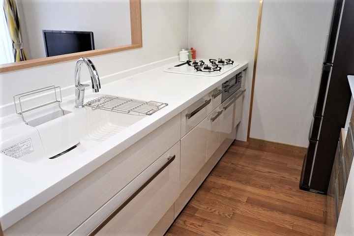ワークトップは人造大理石で掃除がしやすく、2枚扉から2段引き出しになったことで収納量が増え、自動センサー水栓で水仕事もラクラクになりました。