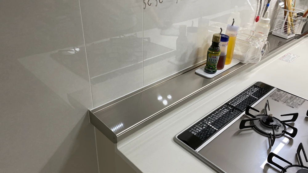 お知り合い宅で便利そうだったとのことで、システムキッチンとは別に、水切りカバーを別途設置して、仮置きスペースを増やしたいとのことでした。おかげで、写真のように、よく使う調理器具や、やかんなども仮置きでき、ご満足いただけました。