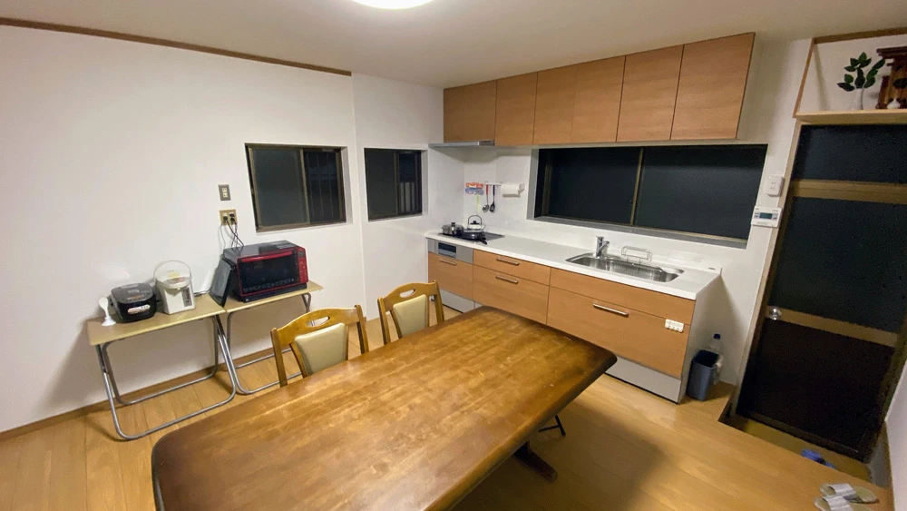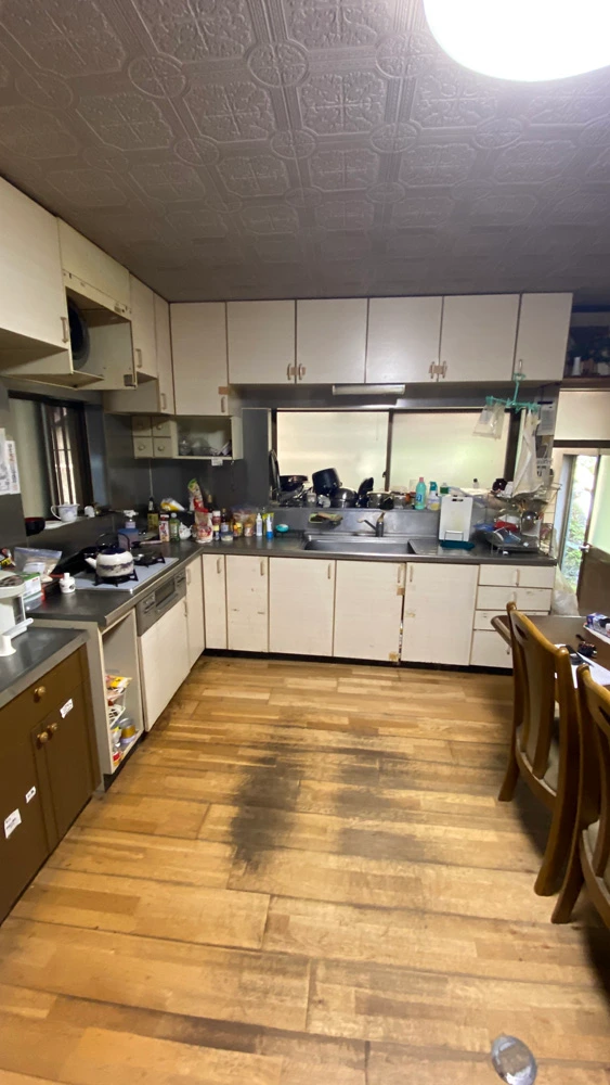 キッチンは老朽化しやすい箇所の一つで、今回はフローリングの張替えも同時に行いました。天井・壁のクロス張り替えは、そのままではクロスを貼ることができない状態だったので、ベニア板で下地を作り直して可能にしました。