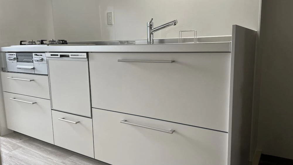 お選びいただいたのはTOTOの「ミッテ」です。汚れがさっと流れるシンクやお手入れがしやすいレンジフードなど、使い勝手のよい工夫が詰まったキッチンです。食洗器も新設したので、食後のお皿洗いからも解放されますね。