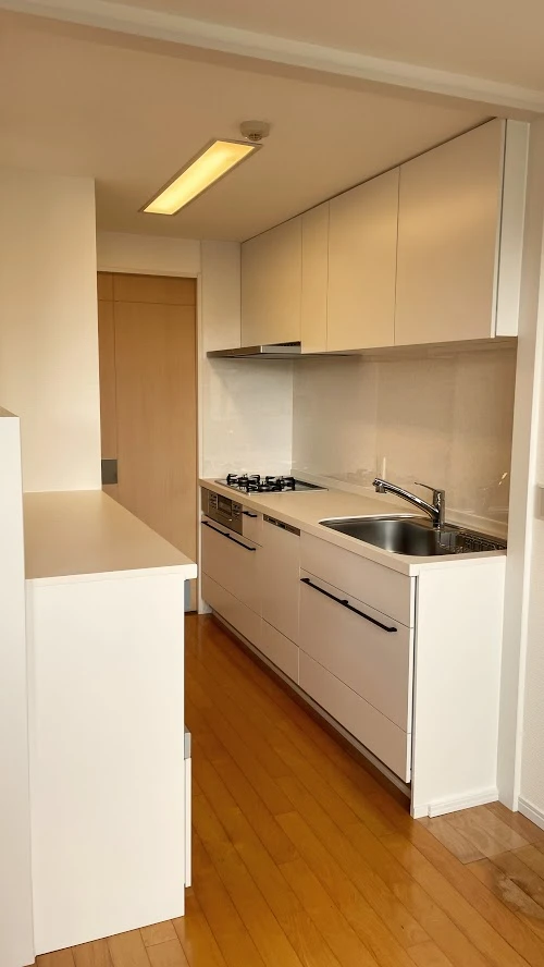 水回り設備は全て一新。キッチンにはクリナップの「ステディア」をお選びいただきました。また、カップボードを腰高サイズに変更したことで開放感がアップしています。