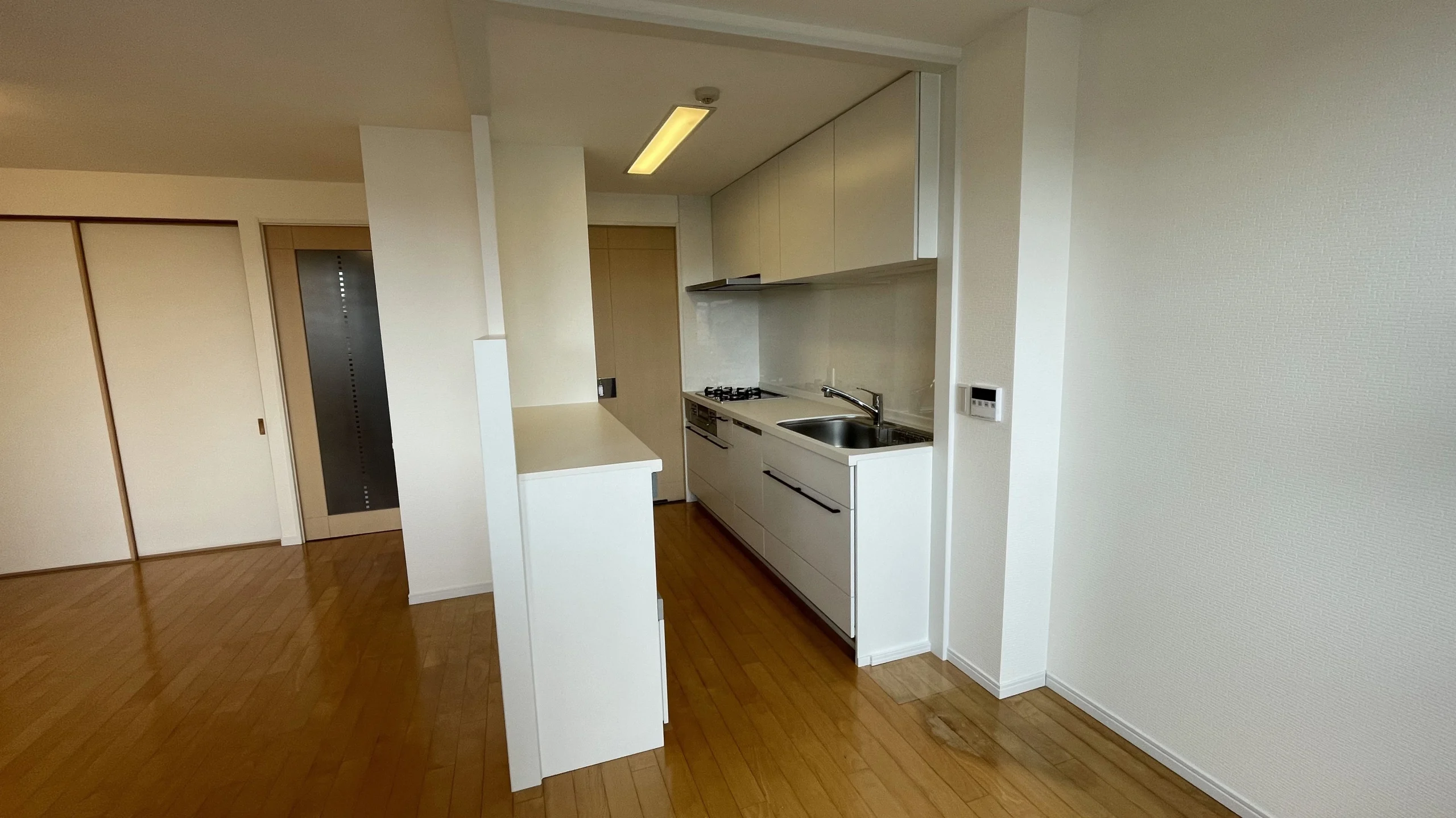 今回のリフォームで吊戸棚は撤去。キッチンが明るくなり、圧迫感がなくなりました。居室側からの見通しも良くなり、開放的なLDKとなっています。
