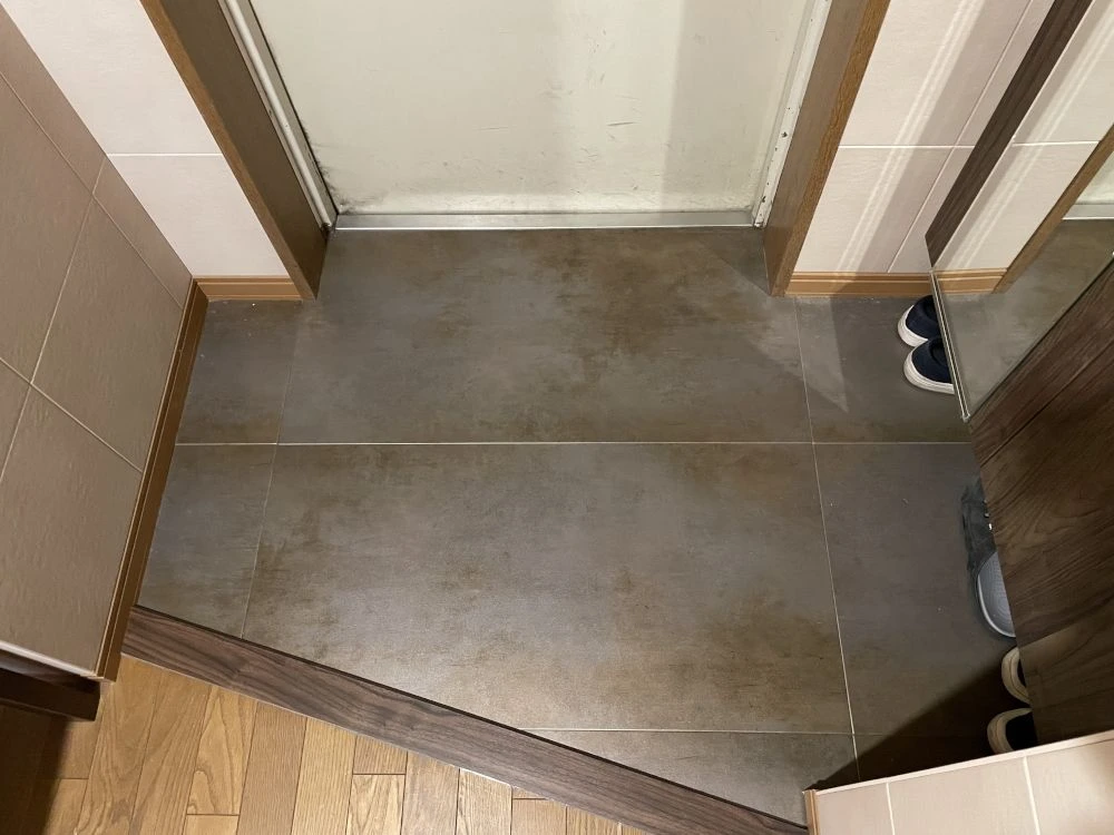 玄関は、天然石のような高級感があるフロアタイルで張り替えました。靴箱も玄関に合うカラーリングでより大型のものに交換し、収納力がアップしています。