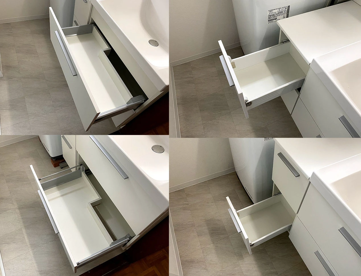 奥にしまったものも、フルスライドで引き出し式の収納で取り出しやすい。また、オプションでウォールキャビネットとトールキャビネットを追加して収納を充実させました。