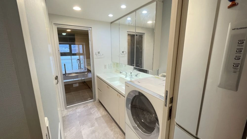 出入口は一枚ガラスにし、洗面所からも浴室窓の外に広がる海の景色を楽しめます。