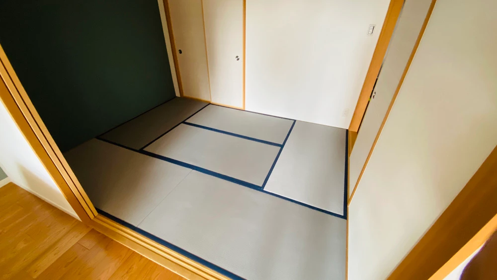 今回は、ハイグレードなセキスイ製樹脂素材の畳をお選びいただきました。樹脂素材なので色あせしにくく、井草素材よりもお手入れがしやすいです。壁のアクセントクロスと縁の色が調和した、おしゃれな空間に仕上がりました。
