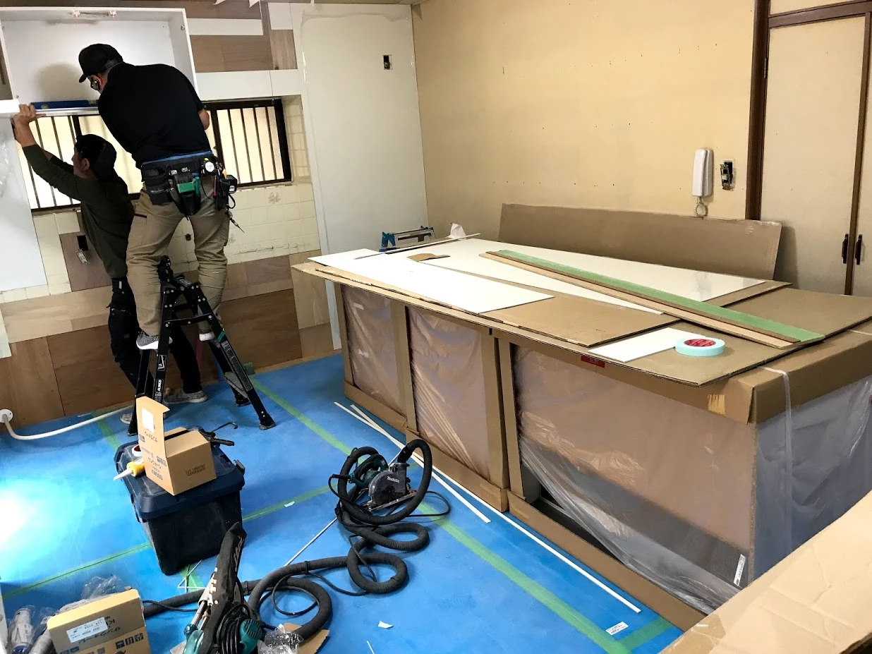 キッチンパネルを張り、新しいシステムキッチンを組立て、設置する作業になります。職人2人がかりで、1日がかりの作業になります。